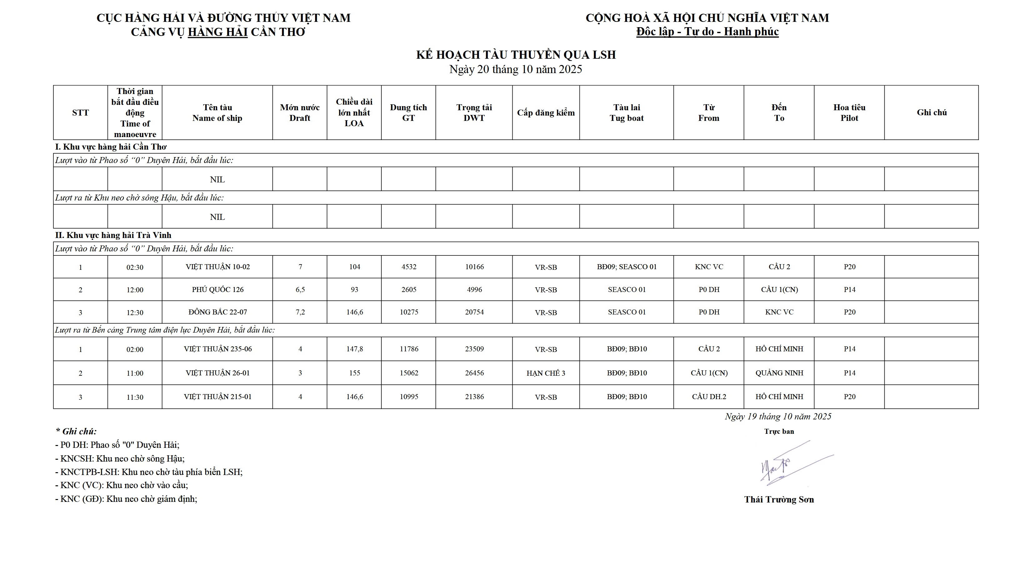 Kế hoạch tàu thuyền qua Luồng sông Hậu ngày 20/10/2025