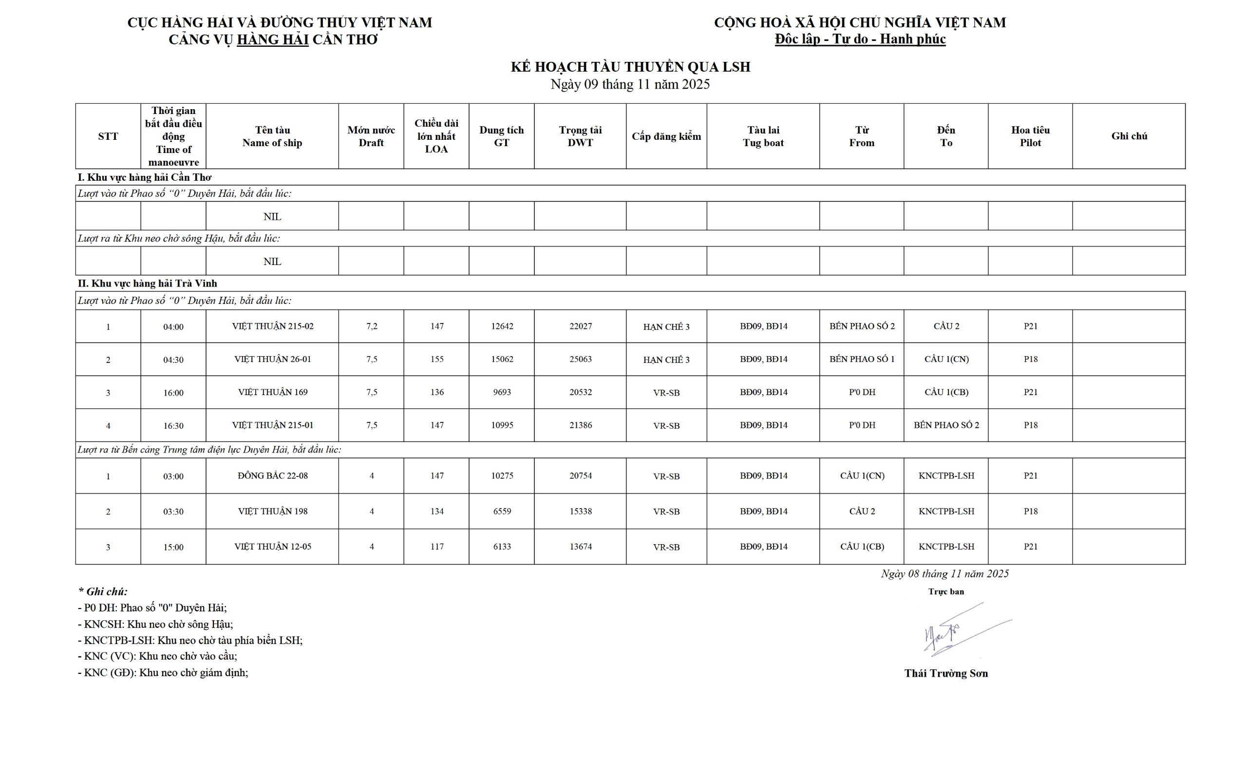 Kế hoạch tàu thuyền qua Luồng sông Hậu ngày 08/11/2025