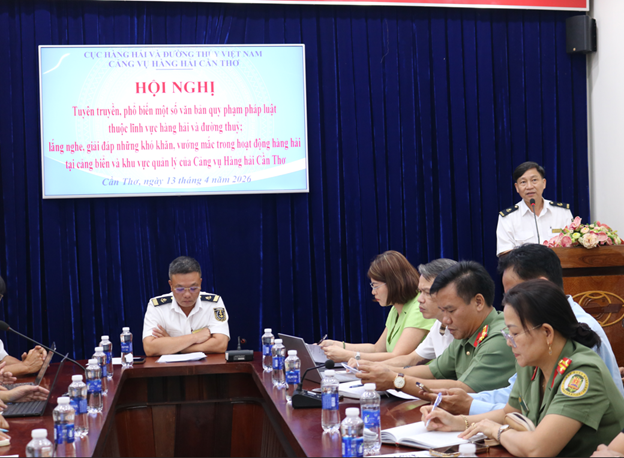 Ngày 13/4/2026, tại Hội trường Cảng vụ Hàng hải Cần Thơ, Cảng vụ Hàng hải Cần Thơ đã tổ chức Hội nghị tuyên truyền, phổ biến pháp luật và đối thoại doanh nghiệp về hoạt động hàng hải trong phạm vi quản lý năm 2026 với sự tham dự của đại diện Cục Hàng hải và Đường thủy Việt Nam, các cơ quan quản lý nhà nước liên quan và đông đảo doanh nghiệp hoạt động trong lĩnh vực hàng hải trên địa bàn thành phố Cần Thơ và các tỉnh khu vực lân cận.